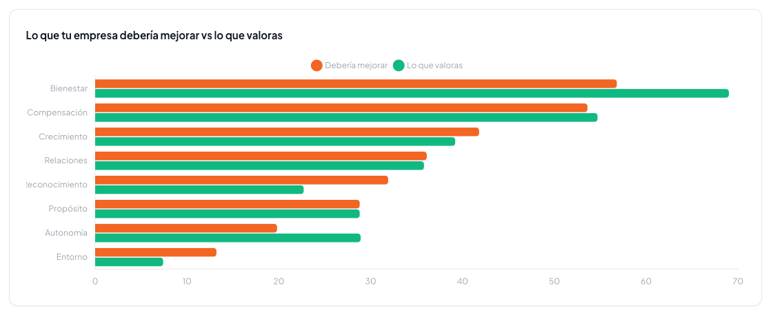 Pero aquí viene el verdadero hallazgo del reporte. Hay un dolor corporativo brutal al que nadie le está prestando atención: el Reconocimiento. Los datos muestran un abismo (un GAP de +9.2 puntos) entre lo que el talento dice valorar y lo que sienten que urge arreglar en la empresa.