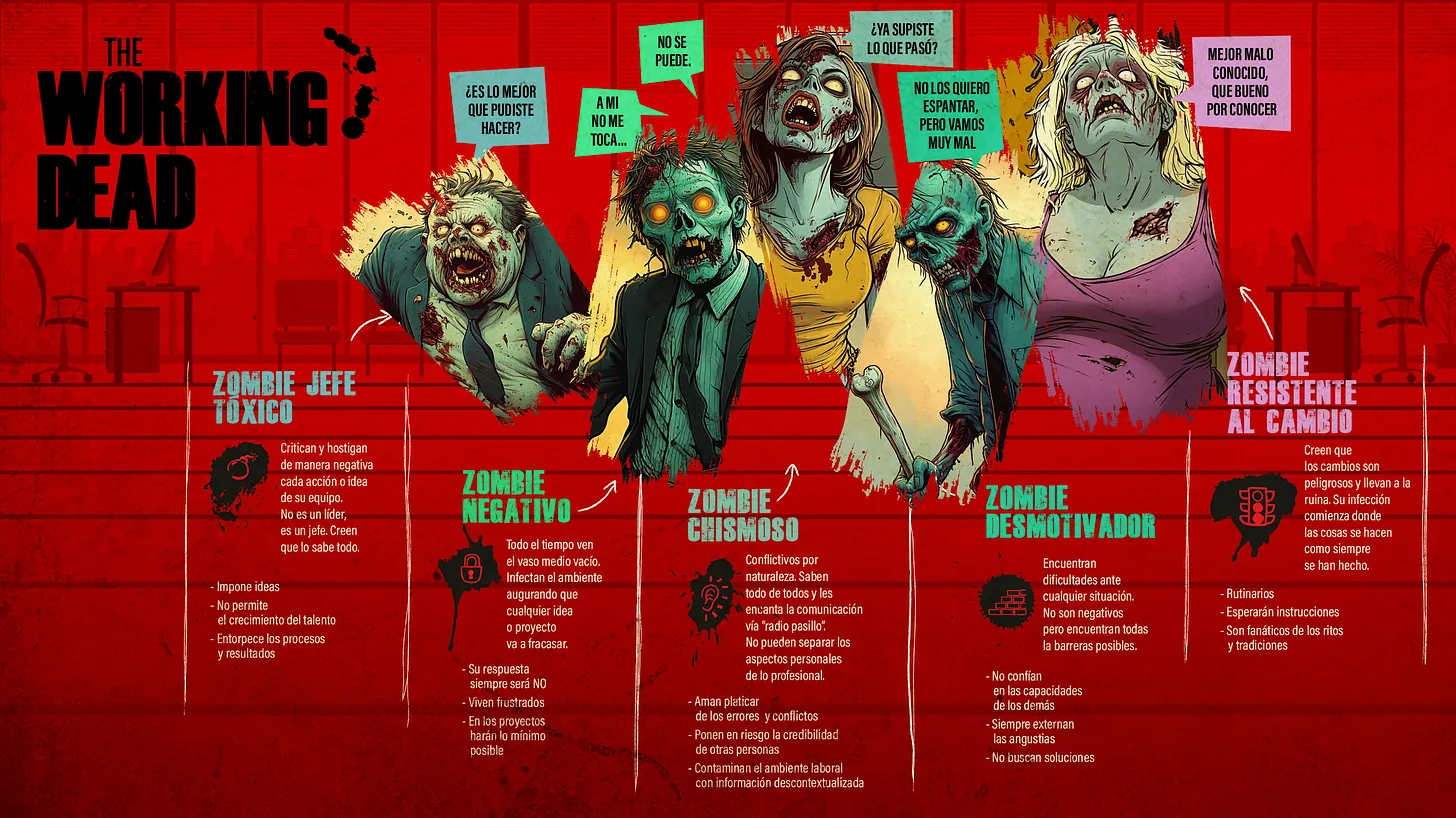 👔 El Zombie Jefe Tóxico: Critican y hostigan de manera negativa cada acción de su equipo. Creen que lo saben todo, imponen ideas y entorpecen los procesos.