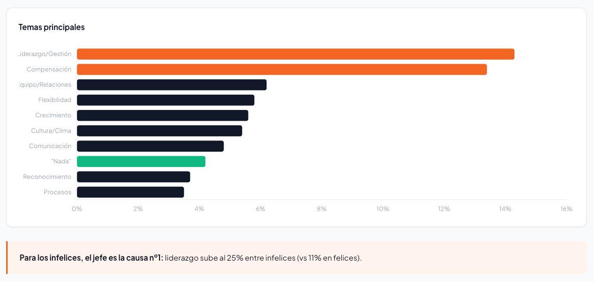 Para los que ya se declaran “infelices”, el jefe es la causa número uno de su miseria (representando el 25% de sus quejas). Ese es nuestro clásico Zombie Jefe Castrador en su máxima expresión: asfixiando el talento a base de ego y juntas inútiles.